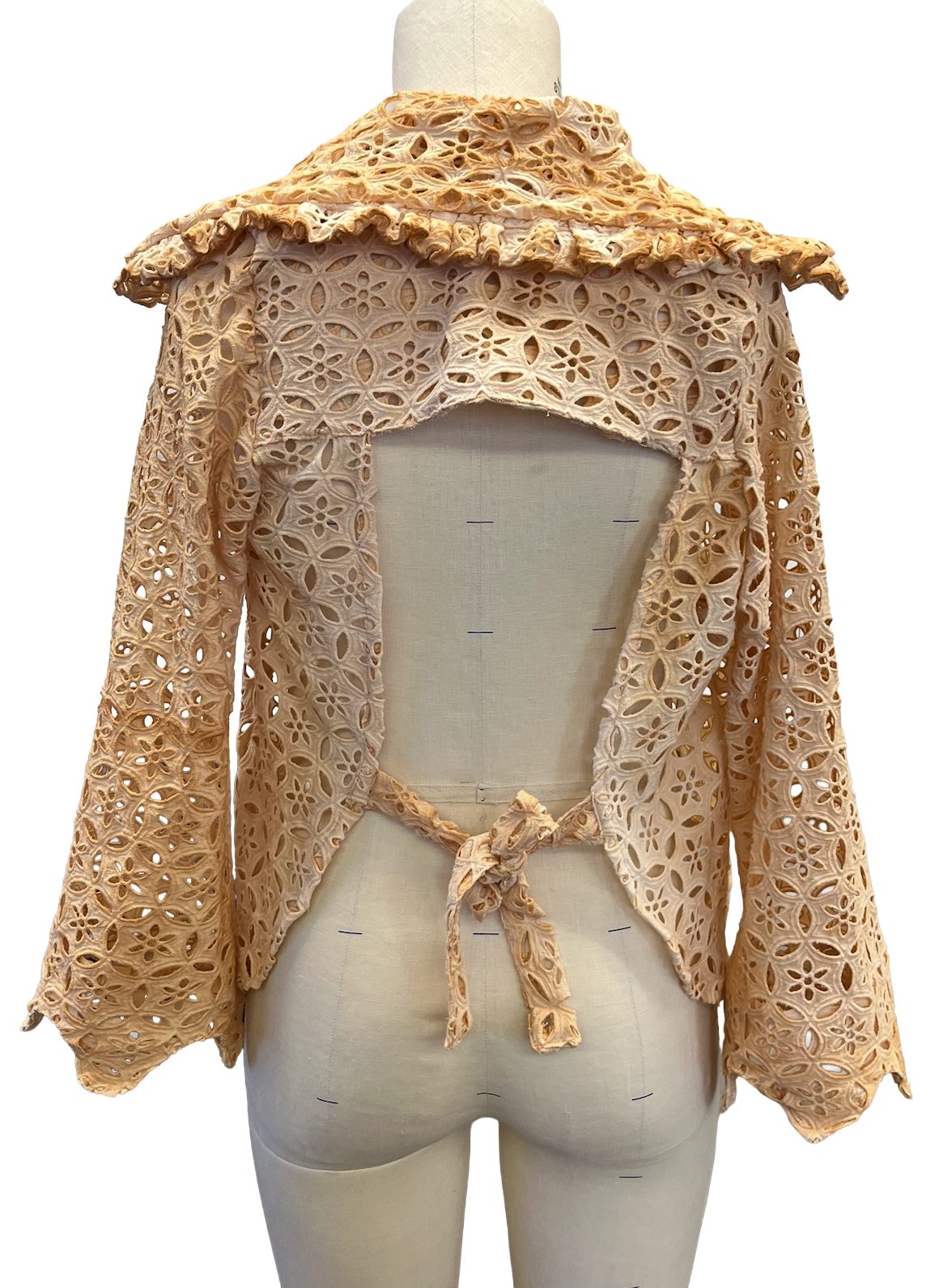 The design process began with detailed CAD illustrations showing both the women’s and girls’ versions of the Cotton Gaudist Blouse in “Walnut” and “Avocado” colorways. Using these technical flats as a blueprint, the final blouse was brought to life in 100% cotton floral-embroidered eyelet voile, naturally dyed with avocados and finished with hand-crafted avocado pit buttons. The finished garment mirrors the CAD vision, showcasing its sculptural collar, asymmetrical front closure, and open-back tie detail.