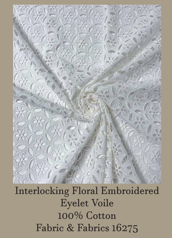 A 100% cotton interlocking floral-embroidered eyelet voile — airy and breathable, with delicate texture and intricate detailing that adds timeless elegance to the garment.